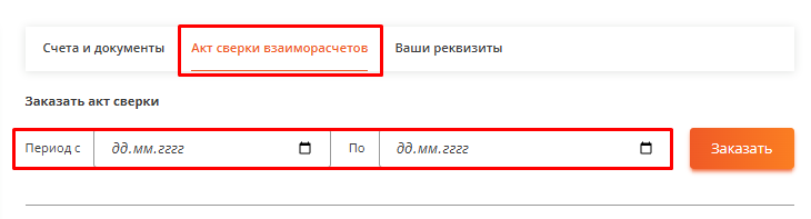 3.В меню «Акт сверки взаиморасчетов», укажите период и нажмите кнопку «Заказать».