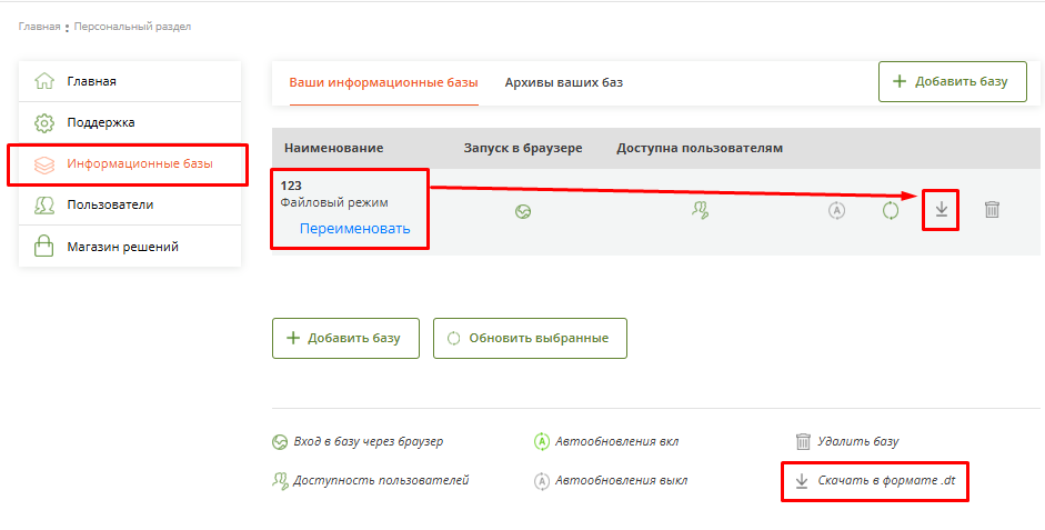 2. В разделе «Информационные базы» напротив нужной базы нажмите кнопку «скачать.dt» (расшифровка символов внизу страницы).