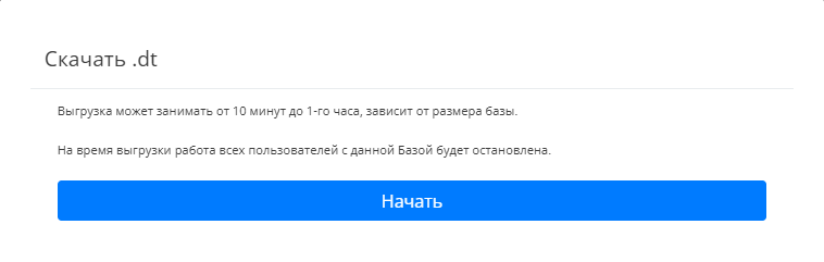 3. Выгрузка может занимать от 10 минут до 1-го часа. На время выгрузки работа с базой будет остановлена. Ознакомьтесь с уведомлением и нажмите «Начать».