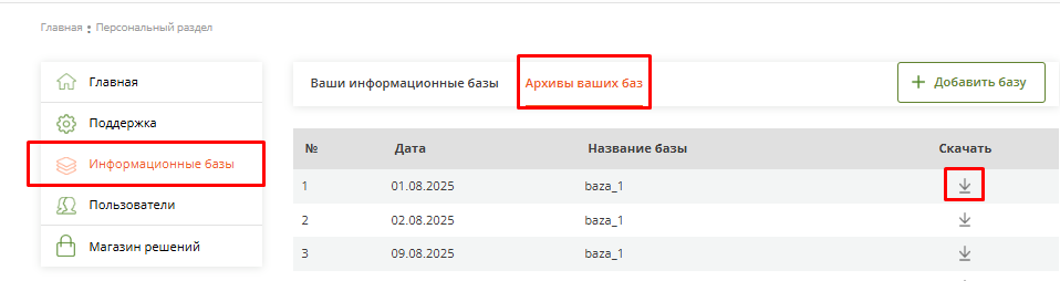 2. В разделе «Информационные базы» выберите «Архивы ваших баз». Выберите нужную копию базы, нажмите иконку для скачивания.