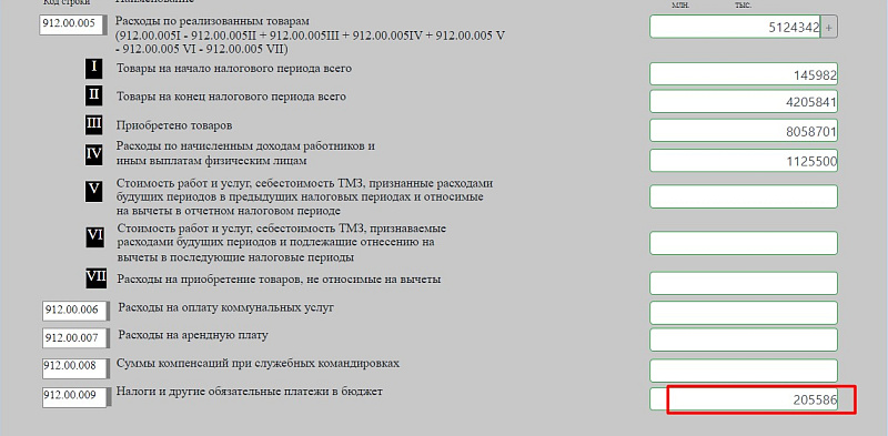 Строку 912.00.005 VII заполняем, если есть расходы, которые не берем на вычет (согласно пп.1 ст. 115 Кодекса вычету не подлежат затраты, не связанные с деятельностью, направленной на получение дохода).