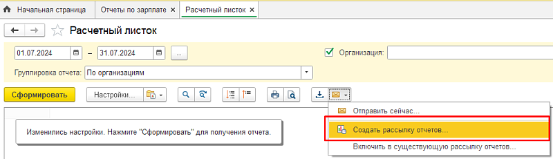 - Нажмите «Расчетный листок», далее выберите «Создать рассылку отчетов».