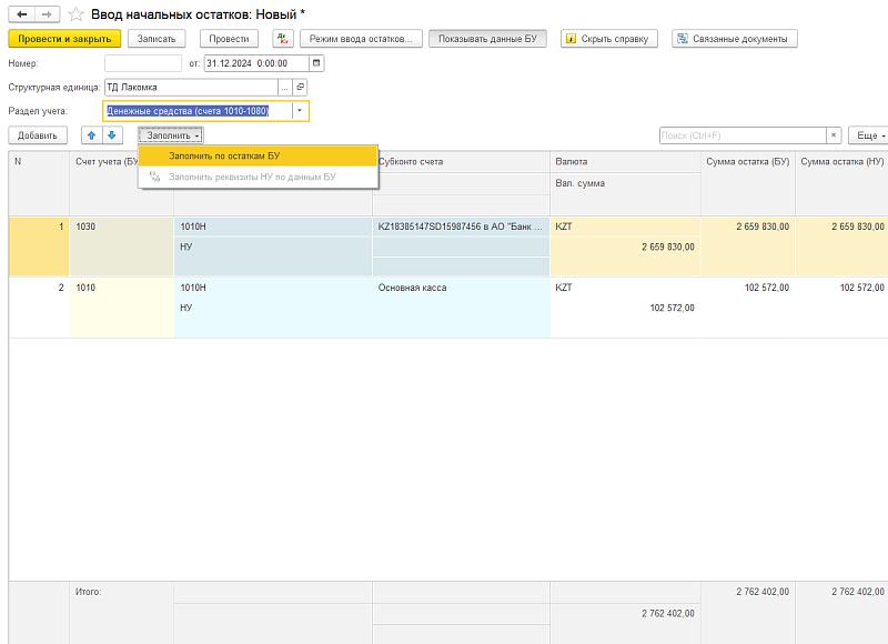 Переходим по кнопке «Заполнить» → «Заполнить по остаткам БУ» — данные подгрузятся автоматически из бухгалтерского учета.