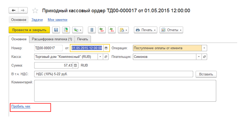 После выполнения настроек в документах «Приходный кассовый ордер» и «Расходный кассовый ордер», при использовании указанной в настройках кассы будет доступна команда «Пробить чек», с помощью которой можно пробить чек на ККТ и передать данные в ОФД в соответствии с ФЗ № 54−ФЗ.