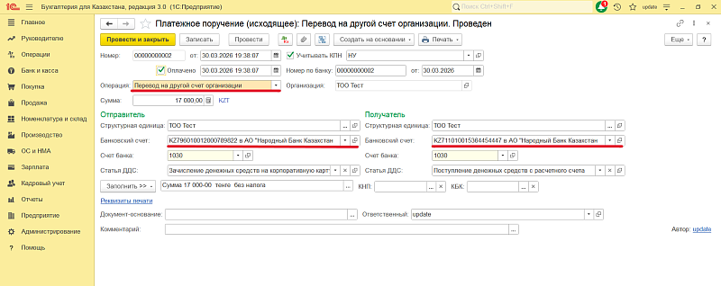 «Перевод на другой счет организации»