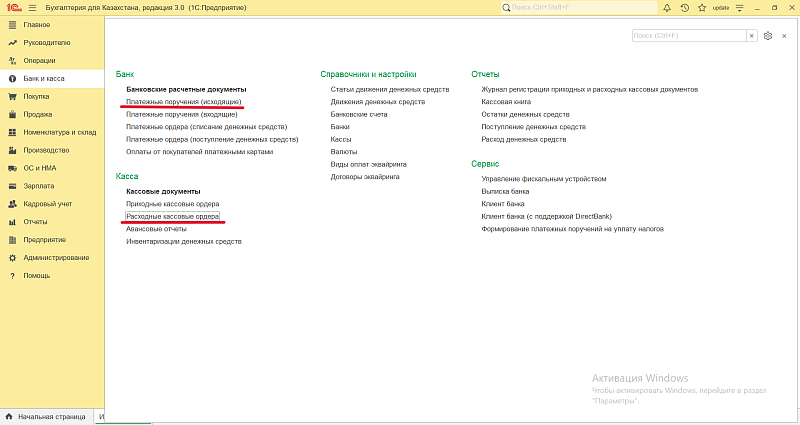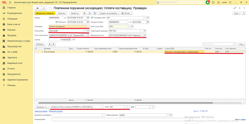 Банк → Платежное поручение исходящее → Создать