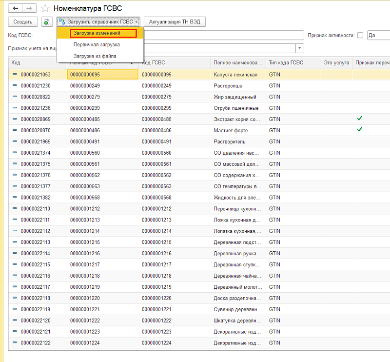 Зайдите «Номенклатура и склад» — «Справочники и настройки» — «Номенклатура ГСВС» — «Загрузка изменений» или «Первичная загрузка».