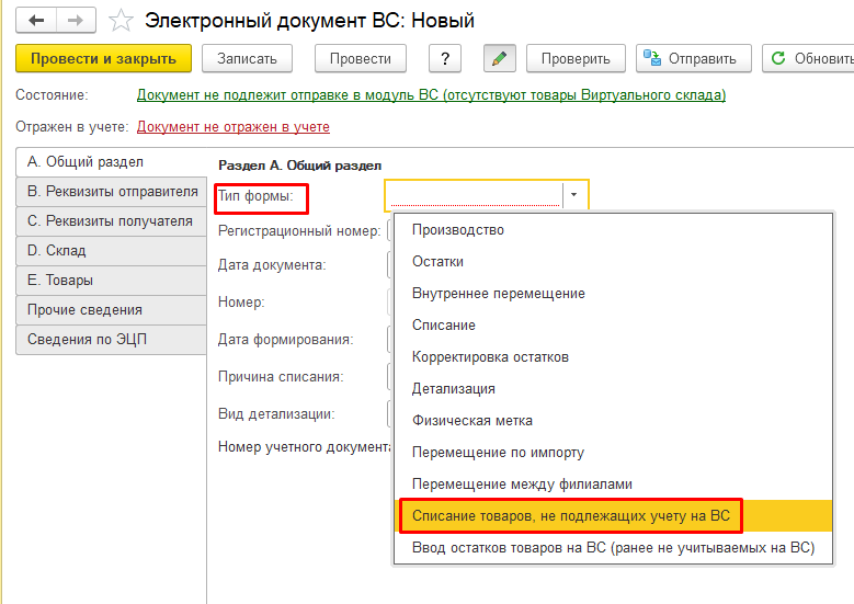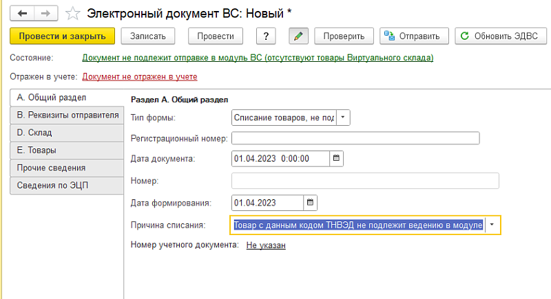 Для списания товара, который по коду ТН ВЭД не подлежит учету на ВС, необходимо сформировать ЭДВС с типом формы «Списание товаров, не подлежащих учету на ВС», с указанной причиной списания «Товар с данным кодом ТН ВЭД не подлежит ведению в модуле ВС».