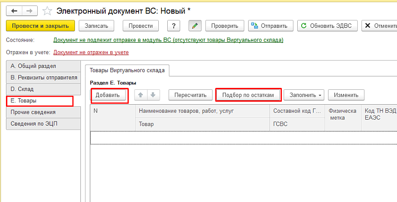 При заполнении через «Подбор по остаткам» необходимо во вкладке «D. Склад» выбрать склад, с которого будут списываться остатки товаров ВС.