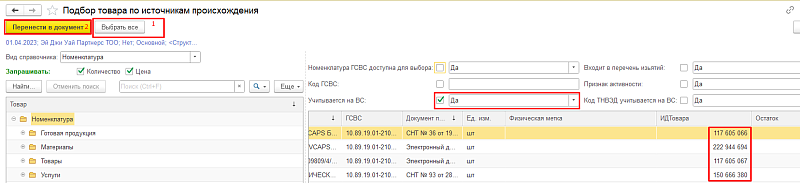 Далее в Подборе отметьте «Да» по признаку «Учитывается на ВС» — отобразятся источники происхождения с признаком «Товар отражен на Виртуальном складе» и присвоенным идентификатором ВС (рис. 2). Необходимо «Выбрать все» и «Перенести в документ», при условии что в Номенклатуре отсутствуют товары, которые подлежат учету на ВС после 01 апреля 2023 года.