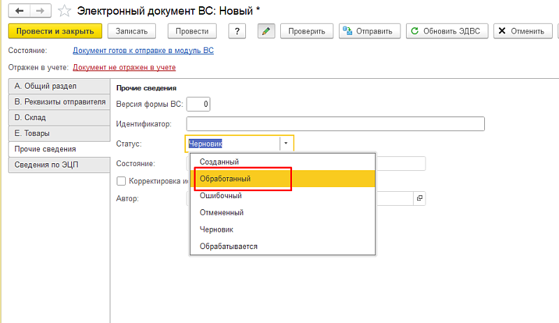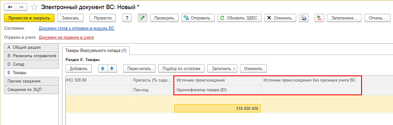 В случае если источников происхождения товара много, рекомендуем использовать выпущенную 1С внешнюю обработку «Помощник оформления ЭДВС по списанию остатков». Она помогает массово создавать, заполнять и отправлять ЭДВС с типом «Списание товаров, не подлежащих учету на ВС» и причиной списания «Товар с данным кодом ТН ВЭД не подлежит ведению в модуле ВС».