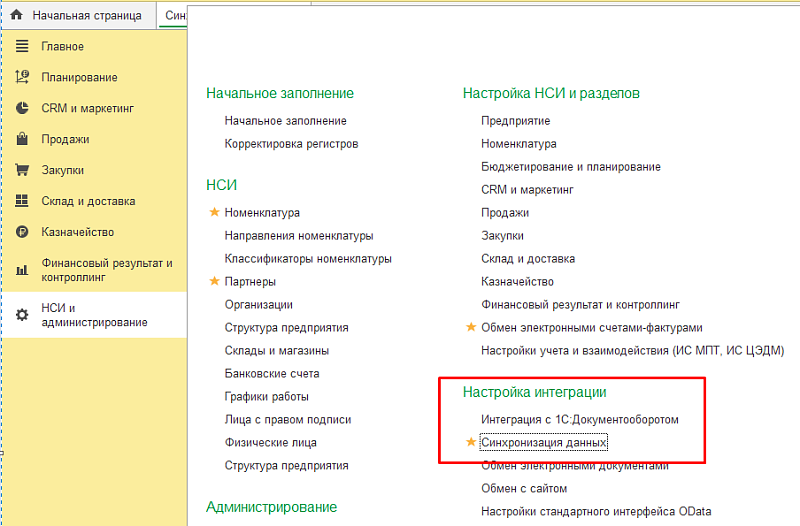 - В разделе «НСИ и администрирование» → «Настройка интеграции» → «Синхронизация данных» включите синхронизацию и задайте префикс базы, по которому документы будут различаться.