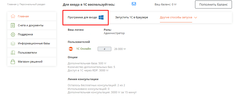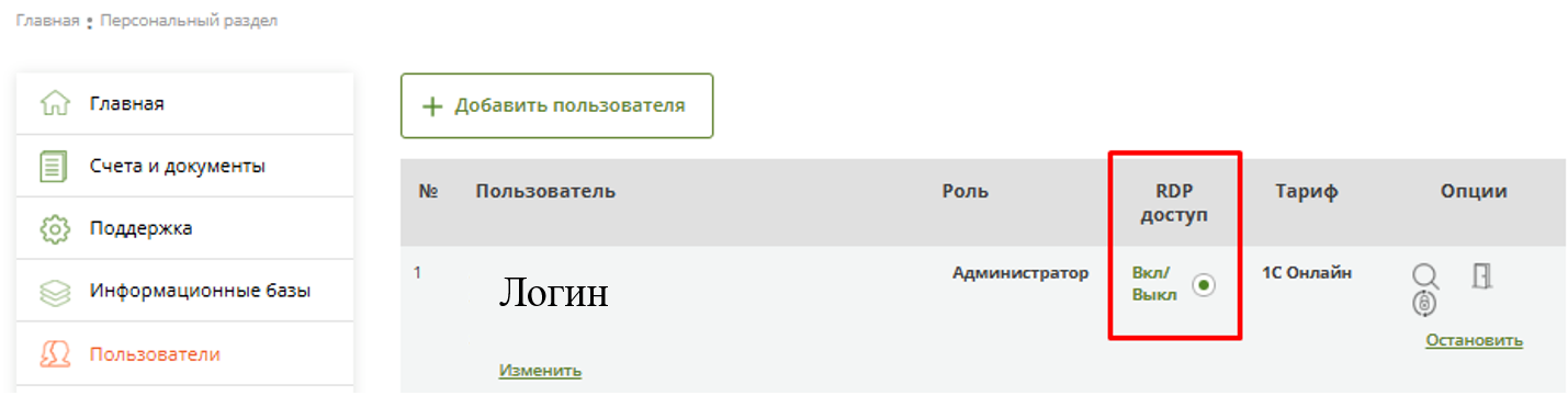 Для запуска базы 2-ой редакции или Конфигуратора, перед 3 пунктом в Личном кабинете в разделе Пользователи включить RDP-доступ.