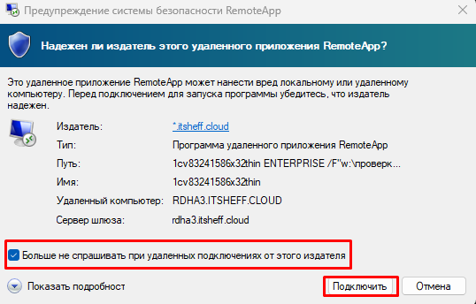 Появится информационное окно для подтверждения. Рекомендуем отметить галочку «Больше не спрашивать при удаленных подключениях от этого издателя» и затем нажать кнопку «Подключить».