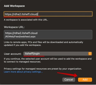 Откроется окно, в котором ввести адрес https://rdha3.itsheff.cloud и нажать Add.