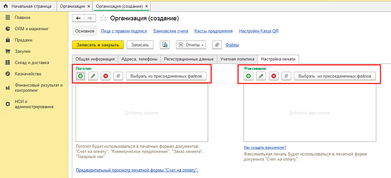 - В открывшейся форме выберите организацию и нажмите на кнопку «+» для загрузки изображения и добавьте логотип и факсимиле.