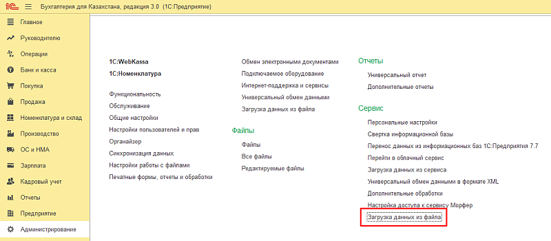 - Перейдите в раздел «Администрирование» → «Сервис» → «Загрузка данных из файла».