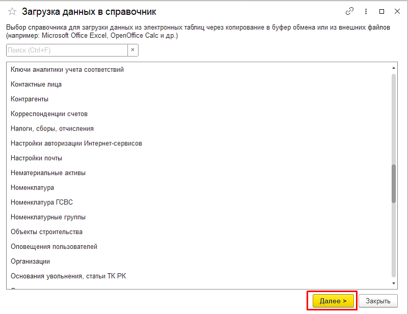 - Откроется форма выбора справочника. Выберите нужный справочник и нажмите «Далее».