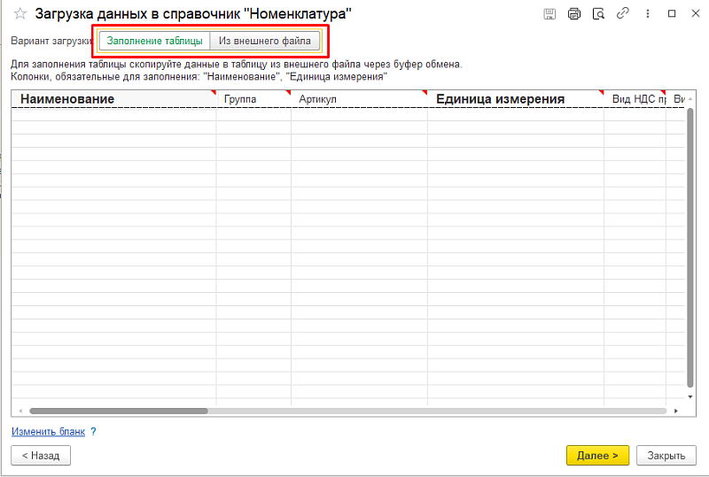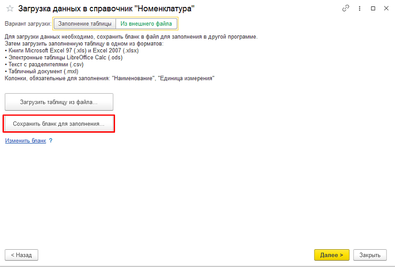 Откроется форма с выбором варианта загрузки — аналогично загрузке в справочники: