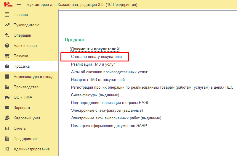 - Откройте раздел «Продажа» → «Счета на оплату покупателю».