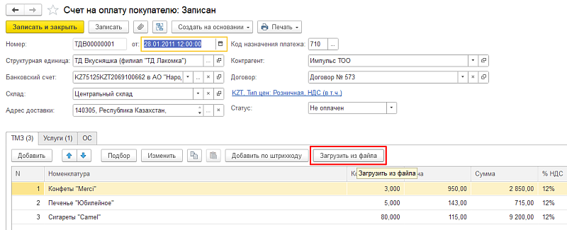 Вариант 2: Загрузка в табличные части документа «Счет на оплату покупателю»
