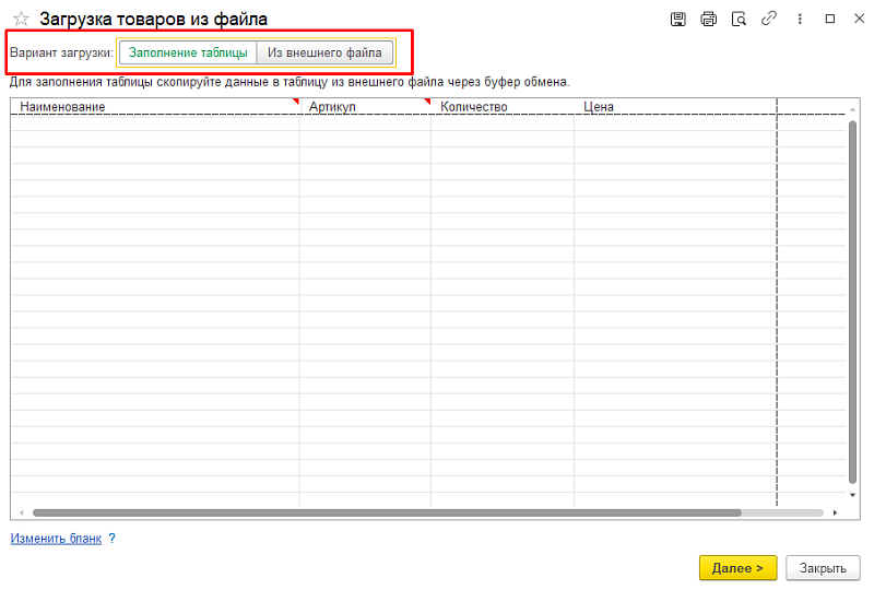 • «Из внешнего файла» — скачайте шаблон, заполните его, затем выберите заполненный файл для загрузки.