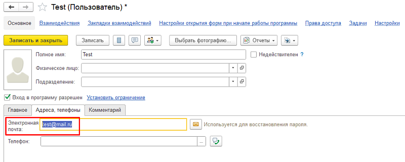 После этого у пользователей появится возможность восстанавливать пароль для входа в 1С через почту без обращения к администратору базы.