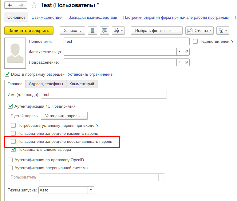 ⚠️ Обязательно убедитесь, что не отмечено поле «Пользователю запрещено восстанавливать пароль».
