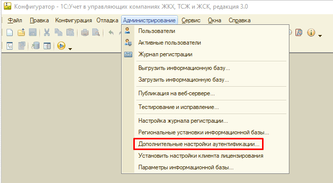 - В режиме «Конфигуратор» откройте «Администрирование» и выберите «Дополнительные настройки аутентификации».