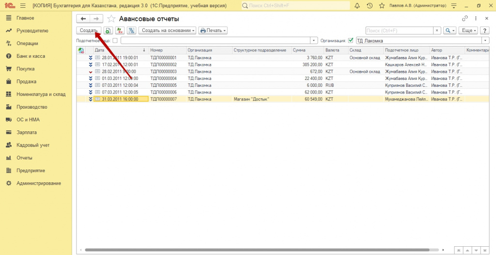 В 1С, в разделе «Банк и касса», есть документ «Авансовые отчеты». После того, как сотруднику выдан расходно-кассовый ордер, либо платежным поручением перечислена сумму на карточный счет, создается документ авансового отчета.