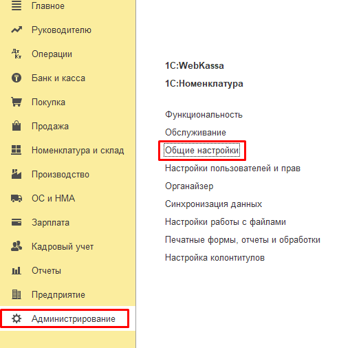 - Далее нужно проверить, установлена ли внешняя компонента в базе. Для этого заходим в базу «Администрирование» — «Общие настройки».