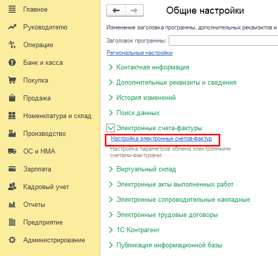 Зайдите в «Электронные счета-фактуры» — «Настройка электронных счетов-фактур».