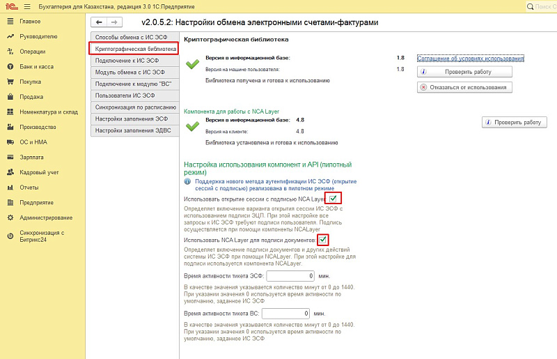 Выберите «Криптографическая библиотека» — «Компонента для работы с NCA Layer». Поставьте галочки в двух местах: «Использовать открытие сессии с подписью NCA Layer» и «Использовать NCA Layer для подписи документов».