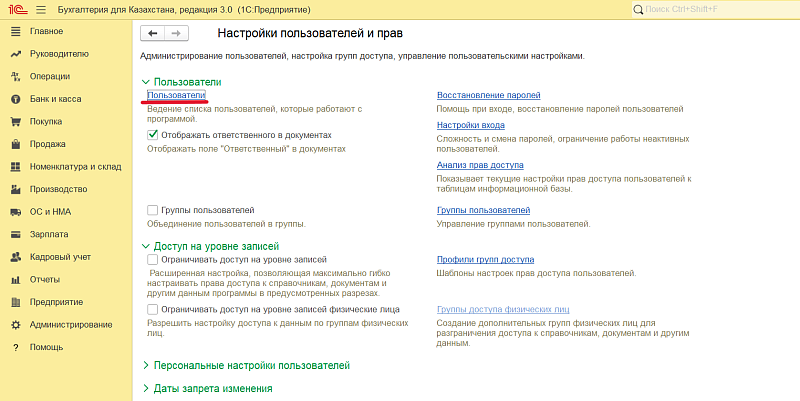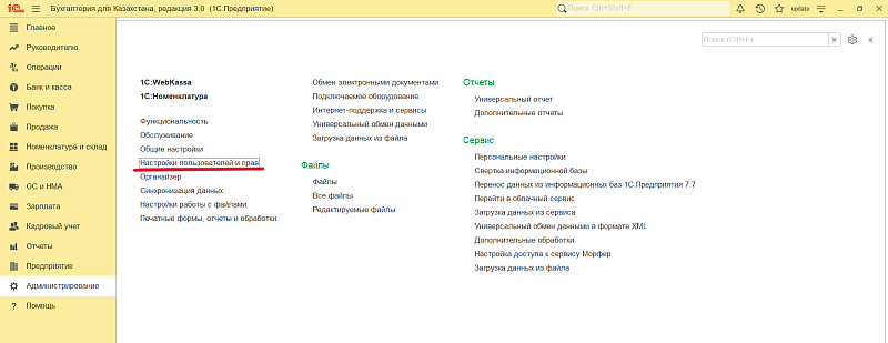 - Перейдите в «Администрирование» — «Настройки пользователей и прав».