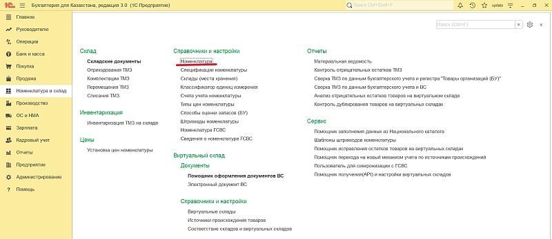 - Перейдите в раздел «Номенклатура и склад» — «Номенклатура».