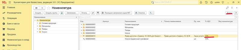 - откройте несколько карточек номенклатуры и убедитесь, что ставка НДС указана как 16%;