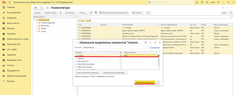 Шаг 3. Массовое изменение ставки НДС в номенклатуре