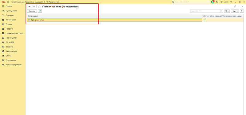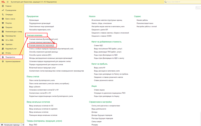 Настройки учетной политики по персоналу «1С: Бухгалтерия 8 для Казахстана», ред.3.0, можно найти там же где и остальные учетные политики: «Предприятие» — «Учетная политика». Выбираем «Учетная политика (по персоналу)».