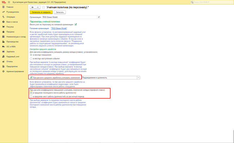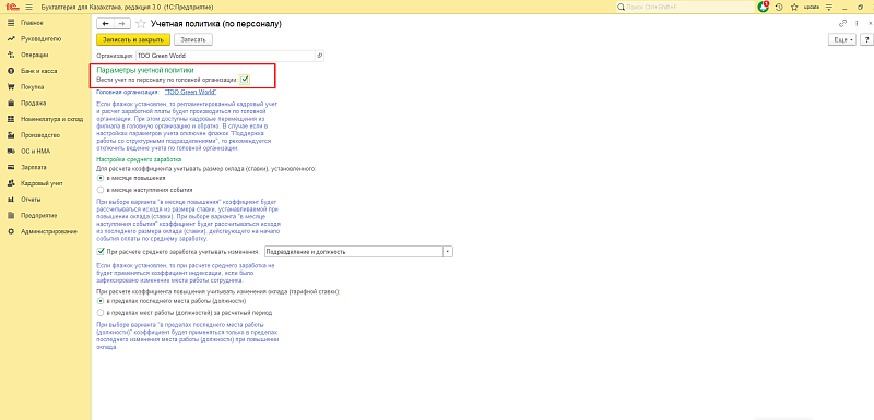 В новой записи указывается организация, для которой делаются настройки. Если у компании есть структурные подразделения, но при этом зарплата рассчитывается в головной организации, то для подразделения ставим признак «Вести учет по персоналу по головной организации» и указываем организацию. Если структурных подразделений нет или они ведут самостоятельный учет, то устанавливать признак не надо.