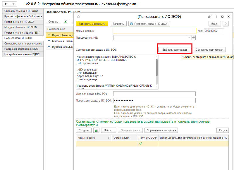 - Заходим в «Пользователи ИС ЭСФ» и отмечаем пользователя, далее «Выбрать сертификат».
