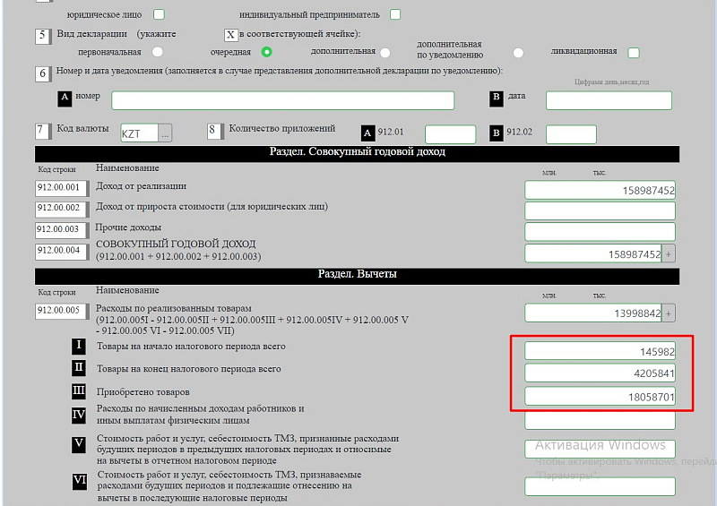 Если декларация от индивидуального предпринимателя, то надо заполнить строки 912.00.010 I−V.
