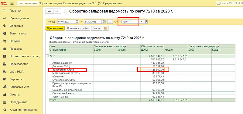 В 1С смотрим сумму начисленной зарплаты по дебету ОСВ 7210 в статьях затрат «Заработная плата».