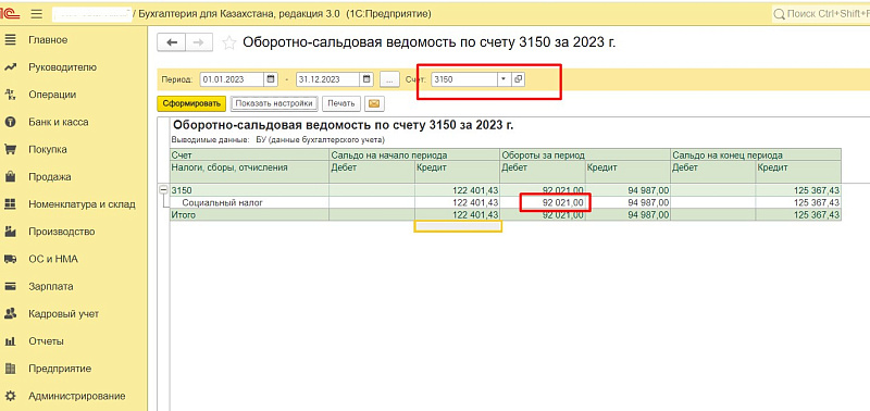 — Социальный налог, уплаченный в пределах начисленного (начисленная сумма — 94 987 тг., уплаченная — 92 021 тг.). Дебет счета 3150.