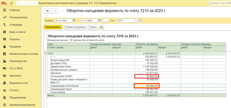 — Социальные отчисления — начисленный дебет счета 7210 по статье затрат «Расходы на СО» 60 900 тг.