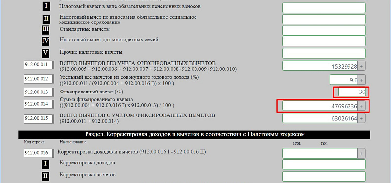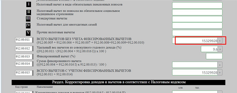 - В строке 912.00.011 отражается сумма всех вычетов без учета фиксированного.