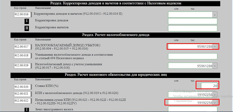 - При расчете КПН у ТОО применяется ставка 20 %. (у ИП ставка ИПН 10%). В строке 912.00.022 отражается итоговая исчисленная сумма КПН, подлежащая уплате в бюджет.