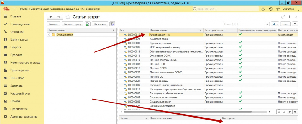 Переходим в подсистему «Предприятие» — «Статьи затрат». Есть статьи затрат, которые предоставлены типовой версией 1С, но вы всегда можете добавить новые значения. В каждой статье затрат, необходимо проставить строку, для отражения в декларации.