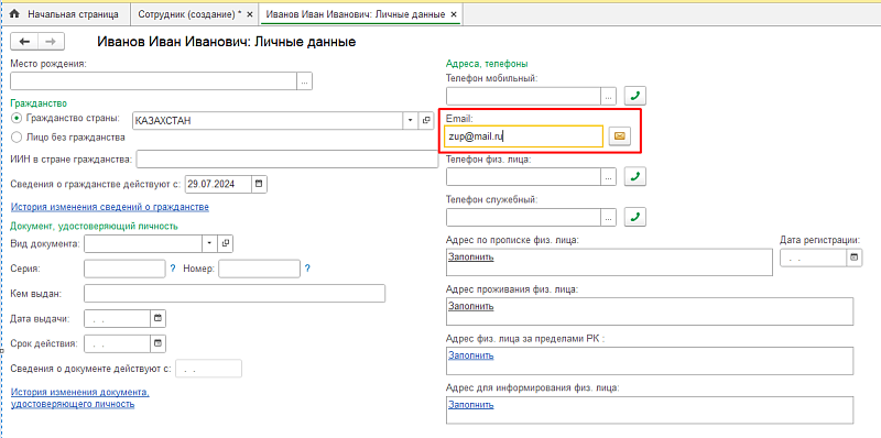 - Перейдите в «Кадры» — «Сотрудники». В карточке каждого сотрудника надо заполнить адрес электронной почты во вкладке «Личные данные».