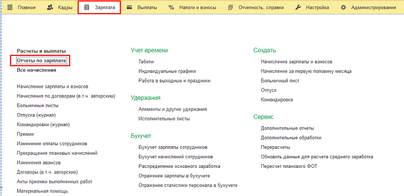 - Для настройки рассылки нужно зайти в раздел «Зарплата», затем «Отчеты по зарплате».