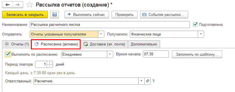 - Далее откройте вкладку «Расписание» и настройте периодичность рассылки.